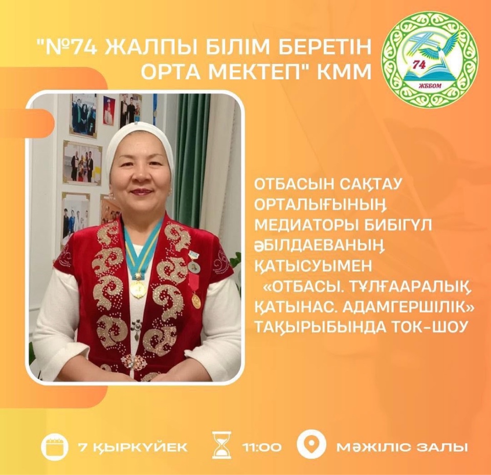 07.09.23 күні мектебімізде отбасын сақтау орталығының медиаторы Бибігүл Әбілдаеваның қатысуымен “Отбасы. Тұлғааралық қатынас. Адамгершілік.” тақырыбында ток-шоу өтеді.