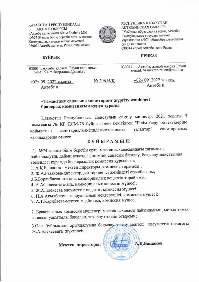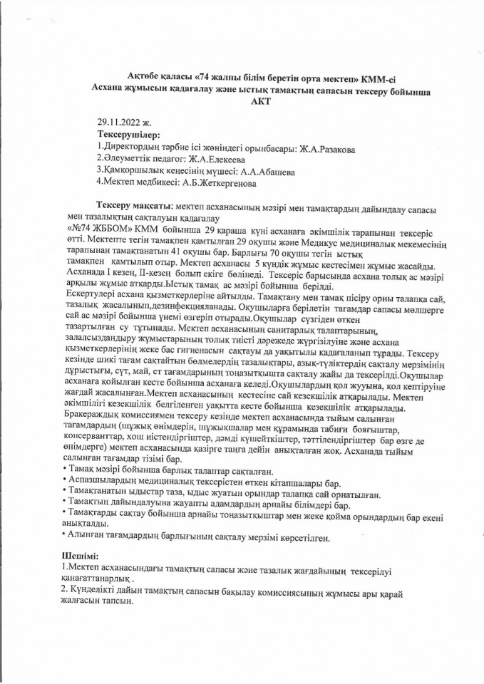 10 қазан күні мектеп асханасының мәзірі, тамақтардың дайындалу сапасы мен тазалықтың сақталуын қадағалау мақсатында бракераж комиссиясының кезекті тексеру жұмыстары жүргізілді. Мектепте тегін тамақпен қамтылған 22 жекелеген санаттағы оқушылар бар. Мектеп асханасы 5 күндік жұмыс кестесімен жұмыс жасайды. Тексеріс барысында асхана толық ас мәзірі арқылы жұмыс атқарды. Ыстық тамақ ас мәзірі бойынша беріледі.Асхана қызметкерлері медициналық бақылаудан өткен, санитарлық кітапшалары реттелген, арнайы киімдермен қамтамасыз етілген. Тексеру кезінде шикі тағам сақтайтын бөлмелердің тазалықтары, азық-түліктердің сақталу мерзімінің дұрыстығы, сүт, май, ет тағамдарының тоңазытқышта сақталу жайы да тексерілді