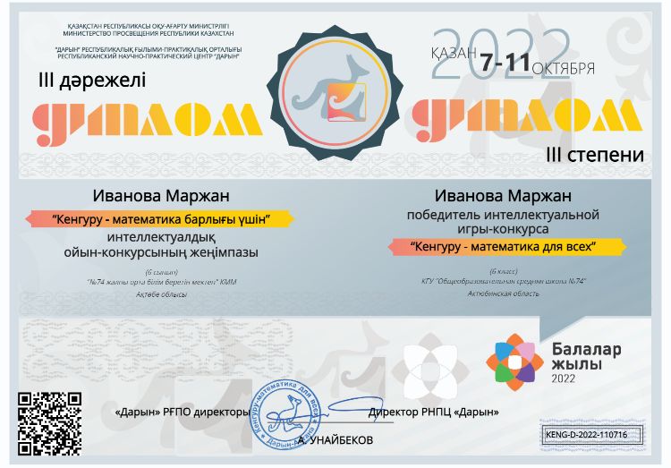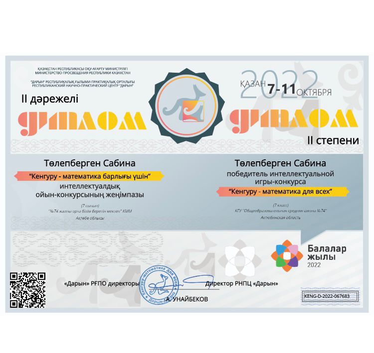 Қазақстан Республикасы 30 жылдығының қарсаңында қазақтың ақиық ақыны М.Мақатаевтың 90жылдық мерейтойына арналған «Мен өмірді жырлау үшін келгенмін...» атты оқушылар арасында өткен қалалық көркемсөз оқу шеберлері байқауына мектебіміздің 8-класс оқушысы Жұбан Мадина қатысып, бас жүлдені жеңіп алды. Жұбан Мадина «Қазақстанның дарынды балалары-2022 атты 5-8 сынып оқушылары арасында өткен республикалық байқауына қатысып, 1-орынға ие болды. Жетекшісі қазақ тілі мен әдебиеті пәнінің мұғалімі Гулжиһан Асқарқызы. Сонымен қатар Жұбан Мадина наурыз айында Республикалық Мұқағали оқуларына қатысып, қалалық кезеңнен 1-орынды иеленіп, облыстық кезеңнен 3-орынды иеленіп отыр.Сонымен қатар, М.Мақатаевтың шығармашылығынан республикалық онлайн өнер-білім байқауына қатысып, «Мәнерлеп оқу шеберлігі» жанры бойынша бас жүлдеге ие болды.