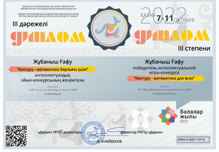 9-11 класс оқушылар арасында жалпы пәндер бойынша республикалық олимпиадасының қалалық кезеңінен 9 "А" класс оқушысы Есенова Айкен 3 орынды иеленді.