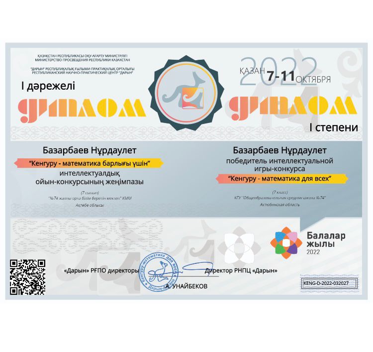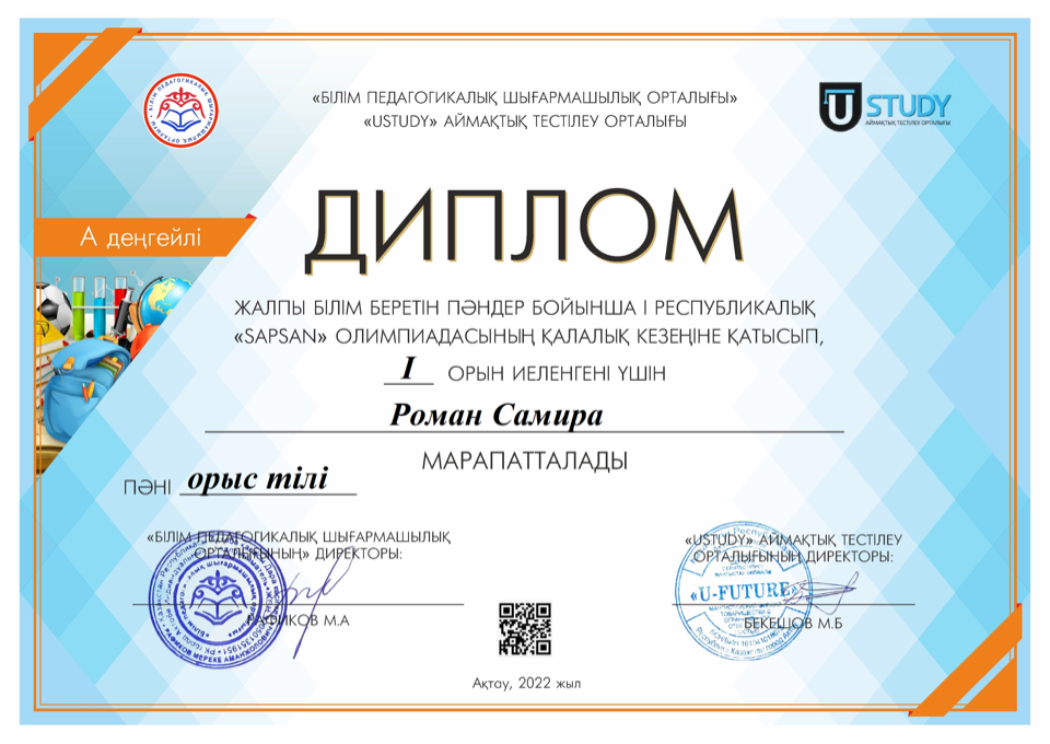 9-11 класс оқушылар арасында жалпы пәндер бойынша республикалық олимпиадасының қалалық кезеңінен 9 "А" класс оқушысы Журтканова Назлы 2 орынды иеленді. Облыстық кезеңінен жүлделі 3 орынды иеленді. 5-6 класс оқушылары арасында өткен республикалық олимпиадасының қалалық кезеңіннен 6 класс оқушысы Жұмабай Інжу жүлделі 2 орынды иеленіп, Абдіжамит Инабат алғыс хатқа ие болды. Жетекшісі: орыс тілі мен әдебиеті пәнінің мұғалімі Жумалина Гульзира Акжигитовна.