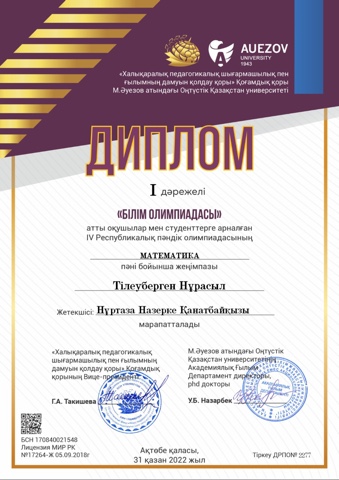 9-11 класс оқушылар арасында жалпы пәндер бойынша республикалық олимпиадасының қалалық кезеңінен 10 "А" класс оқушысы Берікова Нұрай ағылшын тілі пәнінен 3орынды иеленді. Жетекшісі: ағылшын тілі пәнінің мұғалімі Касенова Гулшара Кузембаевна